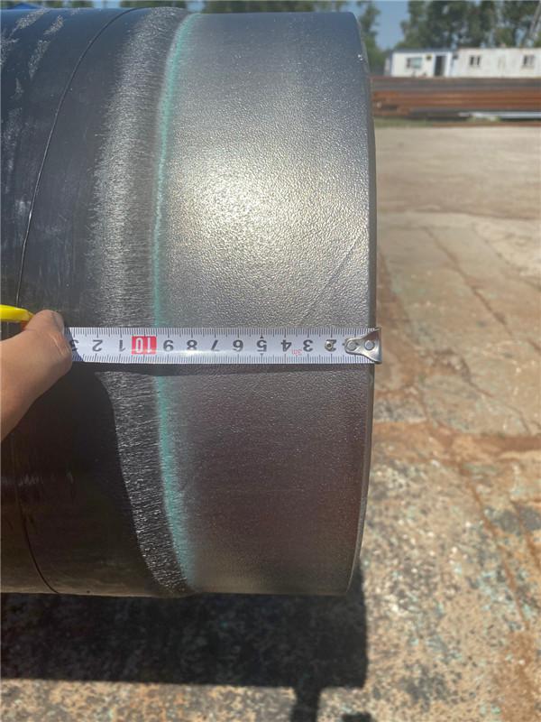 開始生產時,先用試驗管在生產線上分別依次調節預熱溫度及膠粘劑防腐層的厚度,聚乙烯層的包覆采用側向纏繞工藝,應確保搭接部分的聚乙烯完全輥壓密實,并防止壓傷聚乙烯層表面,膠粘劑的涂敷采用側向纏繞工藝,且涂敷必須在環氧粉末膠化過程中進行,以確保膠粘劑與環氧涂料能相互滲透,使其達到各項要求后方可開始生產。